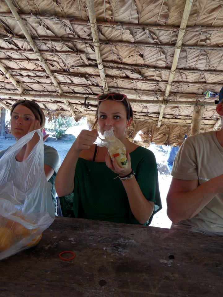 Maar goed, wij hadden ons varken, ons biertje, potje kaarten en de gezeldschap van het opperhoofd van de bergstam, die geen engels kon maar wel de hele tijd een soort Qat zat te eten en coca bladeren zat te roken. Hilarische vent kan ik je vertellen. Na een poosje bier drinken en wat kaartspelletjes verder hadden we trek. Maarja daar heb je niet een zak lays die je even kan pakken. Dus besloot Rambo het ontbijt voor de dag erop vast baas te maken. Rijst uit Bamboestokken. Wij vonden het fantastisch! De volgende ochtend hebben we geholpen nieuwe bamboestokken te maken (Rijst in bamboestok gieten, water erbij en op het vuur leggen). Wat een super ervaring!